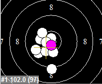 Several members benefited from a session on the Scatt machine with detailed analysis of their shooting leading to useful pointers on how to develop there technique. The image below gives a small part of the Scatt screen which shows how the group is developing as the session progresses. The pink shot is the last shot taken by the shooter. The yellow cross is the location where the rifle was pointing at the time the shot was released.