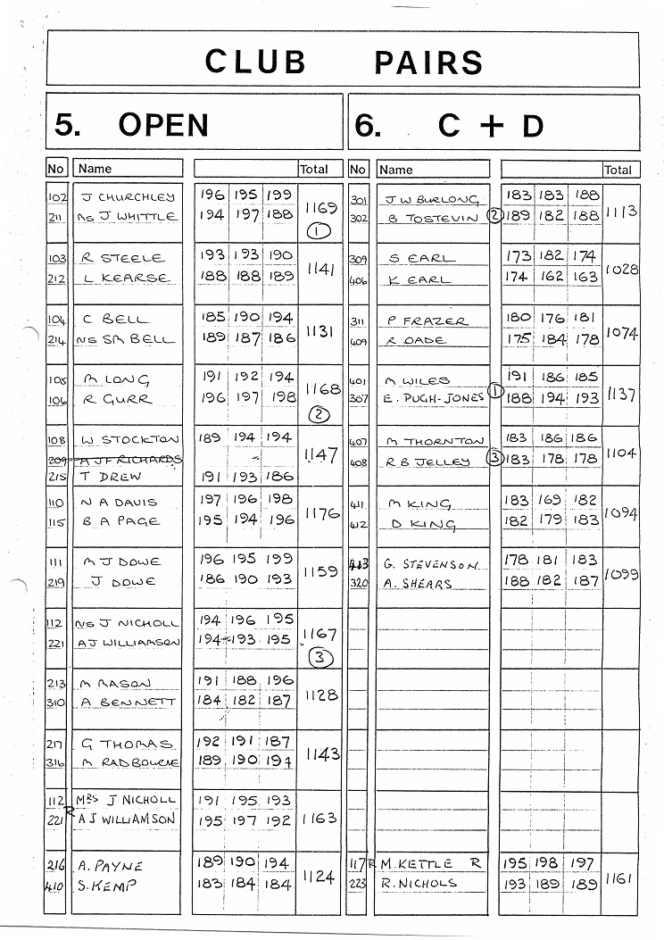 | 5. Open Pairs | J | Churchley | Aldingbourne | 1,169 | ||