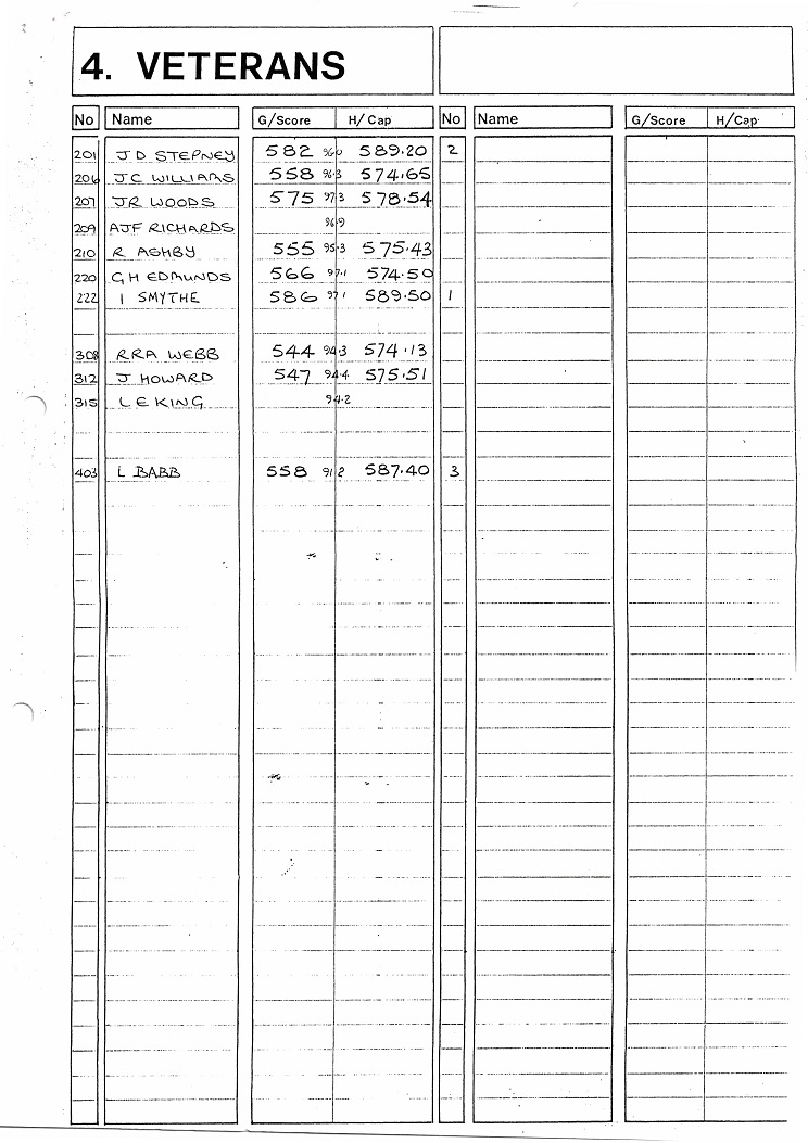 | 4. Veterans (handicap) | I | Smythe | St Nicholas | 589.50 | ||